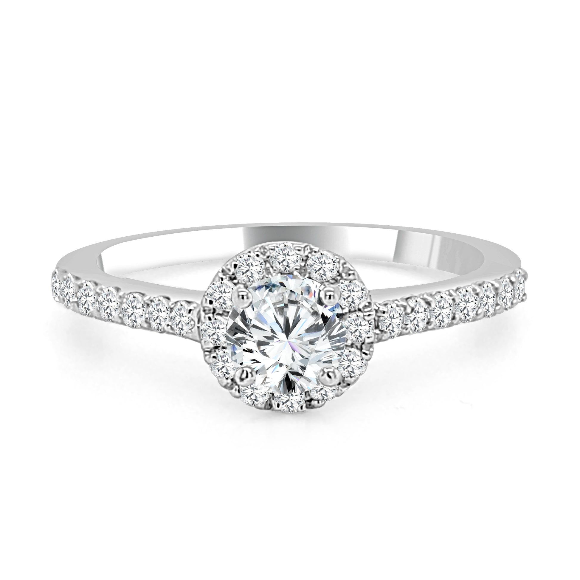 Exquisite 14K white gold engagement ring highlighting a magnificent 0.70-carat round diamond at its heart, encircled by a luminous halo of accent diamonds totaling 0.40 carats. The coordinating band amplifies the ring's radiance and creates a cohesive, polished look. This halo design enhances the center stone's brilliance while offering timeless sophistication and lasting beauty for your most precious moment.