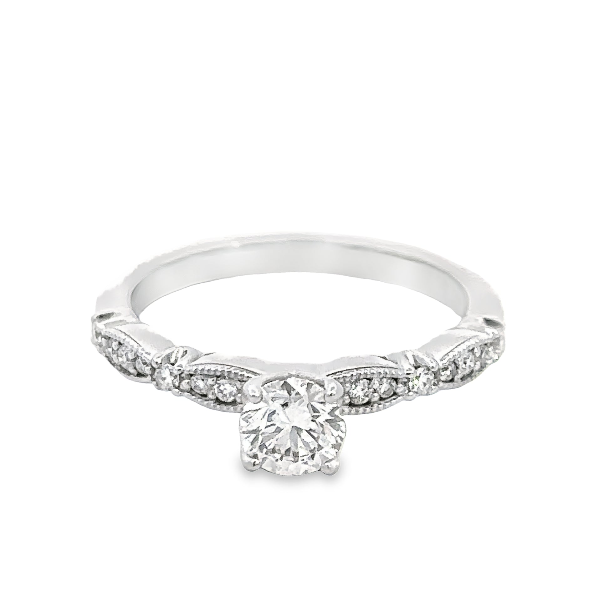 Elegant 14K white gold engagement ring showcasing a brilliant 0.50-carat round diamond paired with 0.15 carats of accent diamonds on an antique-inspired shank with beaded edge detailing. The timeless round cut delivers exceptional sparkle and versatility, while the vintage-style beaded edge adds character and romantic charm. This sophisticated design blends classic diamond brilliance with antique aesthetics, creating a piece that feels both heirloom-worthy and distinctly personal. The intricate shank detailing catches light beautifully and adds depth to the overall design. Ideal for those who appreciate vintage elegance and refined craftsmanship, this ring makes a meaningful statement of commitment with enduring style and grace.