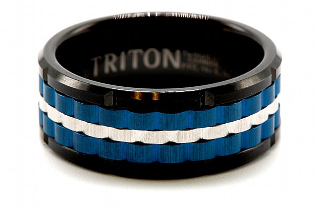 Multi-color tungsten wedding band featuring a distinctive basketweave pattern in black, blue, and white. This 9mm band combines durability with modern style, perfect for everyday wear and special occasions alike.